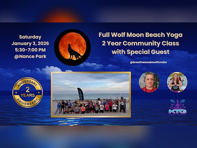 🎉 2-Year Anniversary Community Class with Special Guest Saturday, January 3, 2026 Time: 5:30 PM Location: Nance Park Beach, Indialantic, FL I’m so excited to kick off the new year surrounded by this incredible community. Invite a friend or loved one and meet us at Nance Park for a special anniversary class designed to help you unwind, reset, and let go of anything you don’t wish to carry into 2026. This special class will include a gentle yoga flow followed by a guided breathwork journey led by a special guest BreatheawakewithMike, creating a supportive space for deep relaxation, release, and reflection. Please plan to arrive early to allow time for parking and settling in before we begin. 🌙 What to Expect 30-minute gentle yoga flow on the sand at sunset 30-minute guided breathwork journey Full moon letting-go ceremony Community connection and shared treats after class 🎉What to Bring Yoga mat or beach towel Water Jacket for after sunset Extra blanket for the breathwork portion to stay warm and cozy Optional: A treat to share after class (fruit, cookies, or something festive to celebrate our community) 🥁 Drum Circle Note Please note: The Full Moon Drum Circle will be held the following night. All levels • All ages • Welcome Free Community Event We can’t wait to celebrate this milestone, the Full Wolf Moon, and the beautiful community we’ve built together. ⚠️ Important Beach Access Update We will be gathering in our usual spot on the beach, however please note the following change: The beach access behind the restrooms is currently closed for repairs. Please use the boardwalk access across from Cold Stone and Lily’s. Walk a short distance to our usual gathering area Meet Your Hosts: Kate Hunt (aka Kate The Great) is a passionate yoga teacher, sound practitioner, and wellness enthusiast based in Melbourne, Florida. She is the founder of KTG Yoga & Wellness, where she offers transformative experiences that promote balance, relaxation, and personal and spiritual growth. With a background in corporate leadership and over 5 years of teaching experience, Kate specializes in full moon beach yoga community gatherings, myofascial release classes, private and group sound baths, corporate wellness programs, and hosting international wellness retreats including her upcoming Return to Rhythm Costa Rica Yoga Retreat in January 2027. Kate believes in creating inclusive, heart-centered spaces for people of all levels to reconnect with themselves, feel supported, and move through life with greater ease and empowerment. @ktgyoga www.ktgyoga.com Breathe Awake with Mike Your guide Mike was introduced to this style of breathwork about 9 years ago. From the very first session he released so much traumatic energy. Breathwork has also help him discover clues to his path through this life. Three years ago Mike followed his heart and learned to guide this breathwork so he could share it with others, just as he followed his heart when he moved to Melbourne in October 2025. He is grateful for all of the wonderful people he's met and welcomes any good vibes. Yoga. Breathwork. Meditation. Reiki. www.breatheawakewithmike.com