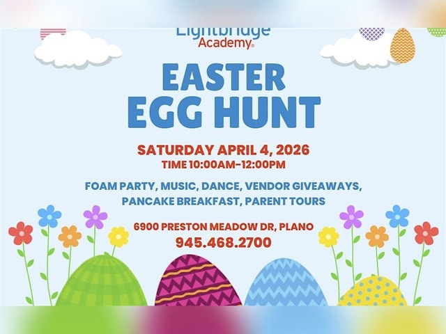 Easter Egg Hunt with foam party, pancake breakfast, music, and prizes Come, join us for our Easter Egg Hunt with a Foam Party, Pancake Breakfast, Music, Dance, Giveaways, Parent Tours and more!