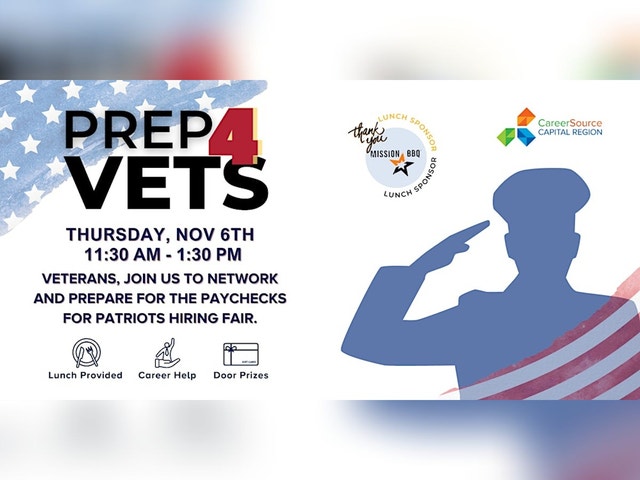 Veterans and eligible veteran dependents who are looking for work are invited to join us for lunch and door prizes while also preparing to enter the workforce. Network with other veterans, meet with career experts, and preview the employers who will be at the Paychecks for Patriots Hiring Fair! This lunch and learn event will be in-person at the CareerSource Capital Region Leon Career Center and is limited to the first 24 veterans who register. Lunch will be provided by Mission BBQ at no cost. Please register and bring a copy of your updated resume. If you have questions regarding this event, call (850) 922-0023 or email HireMe@careersourcecapitalregion.com with the subject Prep for Vets Question.