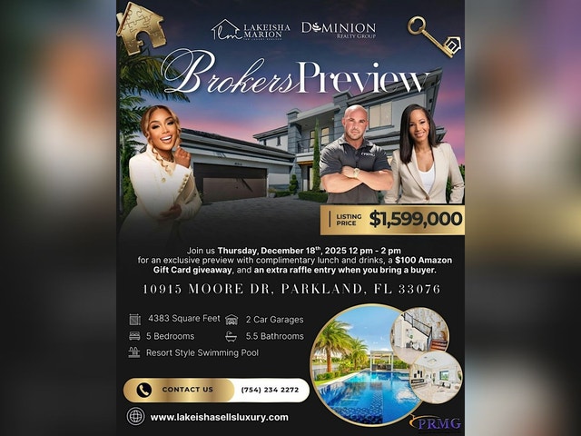 ✨ EXCLUSIVE BROKER PREVIEW ✨ 🔑🏡 Attention Real Estate Agents! 🏡🔑 You’re invited to an exclusive broker preview of an incredible luxury listing you won’t want to miss. 📅 Thursday, December 18 ⏰ 12:00 PM – 2:00 PM 🥂 Enjoy complimentary lunch, champagne & bubbly 🎟️ Raffle entry to win a $100 Visa Gift Card Property Preview: Tour this rare Silverstone model in Cascata at MiraLago — a stunning 5BD / 5.5BA waterfront home with a private pool and Next Gen in-law suite. Featuring a chef’s kitchen, smart home upgrades, impact windows, and a resort-style backyard with heated pool, spa, waterfall & custom summer kitchen. 🔑 Hosted & Exclusively Listed by Dominion Realty Group 🤝 Sponsored by PRMG | David Rodriguez 📲 RSVP today