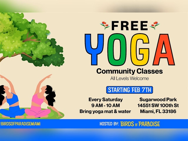 We are Birds of Paradise Miami! Our goal is to create a yoga community that brings connection, balance, and accessible wellness to our local area! Our mission is to guide you back to your center - a place of stillnes and presence. Bring your loved one, a friend or come solo and flow with good vibes! Join us for a free, all-levels yoga session in the park. This class is open to everyone and focuses on gentle movement, breath, and relaxation in a welcoming outdoor setting. Date: Every Saturday Time: 9:00 AM — 10:00 AM Location: Sugarwood Park — 14551 SW 100th St, Miami, FL 33186 What to Bring: • Yoga mat • Water bottle We meet every Saturday at Sugarwood Park from 9-10am!
