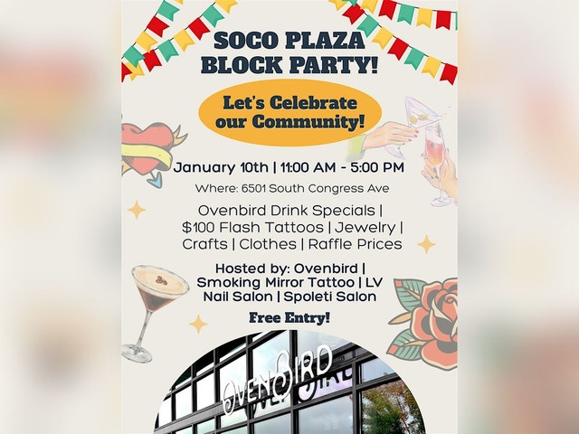 Welcome to our first annual SoCo Plaza Block Party! We will have local art/craft vendors, Ovenbird drink specials, $100 Flash Tattoo by Smoking Mirrors Tattoo and a fun raffle with great prizes! Free entry!