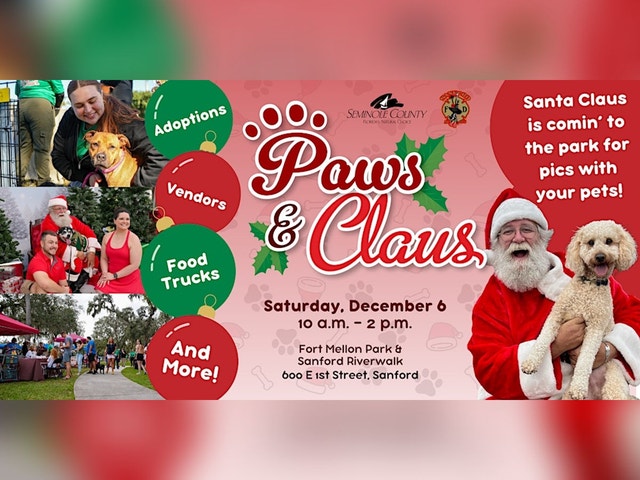 Mark your calendars for Seminole County Animal Services’ third annual adoption event, Paws & Claus! From adoptable dogs and cats to pet-themed vendors, food trucks and holiday cheer – Paws & Claus is sure to be a good time. And yes, Santa is once again making his appearance for pet photos! When: Saturday, December 6, 2025, 10a.m. – 2p.m. Where: Fort Mellon Park & Sanford Riverwalk Rescue partners and vendors interested in participating can email SCASappointments@seminolecountyfl.gov for more information.