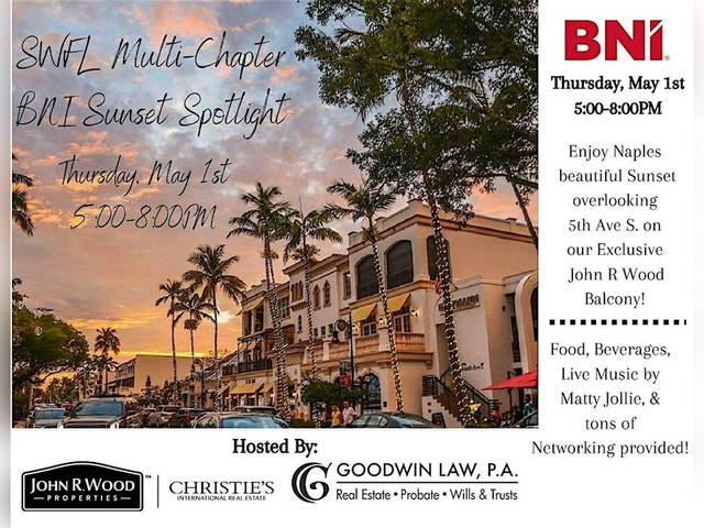 SWFL's Multi Chapter BNI Sunset Spotlight Come join us for an evening of networking and collaboration at the Sunset Spotlight event! Hosted by John R Wood Properties & Goodwin Law. This in-person gathering will take place at 787 5th Ave S. Connect with fellow professionals, exchange business ideas, and watch the sunset together. Don't miss out on this opportunity to expand your network and grow your business. See you there!