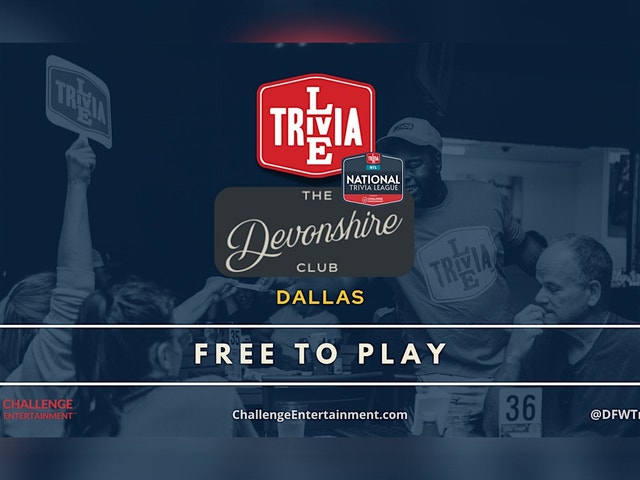 DALLAS/LOVERS LN - NEW WEEKLY CE SHOW! #FREE Starting 1/20, join us at The Devonshire Club every TUESDAY at 7:30PM for a weekly #LiveTrivia party like no other. NTL is ON! Register your team for our National Trivia League at ChallengeEntertainment.com - Play, Compete, and WIN all 2026! #Free to Play and Join! Whether you dominate in pop culture or crush it in random facts, there's a prize waiting for your team! Don’t just go out—play your night out. #DFWTrivia powered by ChallengeEntertainment.com for a #BetterNightOut #thedevonshireclub #TriviaInDallas #TuesdayTrivia #WhatToDoTonight #YourThirdSpace #NTL2026 The Devonshire Club - 5757 W Lovers Ln Suite 101, Dallas, TX