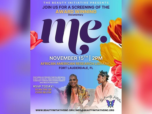 The Beauty Initiative is proud to announce a special screening of the groundbreaking documentary Me Period. This award-winning film explores the beauty, challenges, and empowerment of puberty and menstruation through the eyes of Black families. The screening will take place on Saturday, November 15th at African American Research Library and Cultural Center in Fort Lauderdale. Me Period dives deep into the intimate and often taboo conversations surrounding menstruation, puberty, and health discovery in Black communities. The film shines a light on how intergenerational discussions, health education, and the lived experiences of everyday families—including special appearances by celebrity mothers Sheryl Lee Ralph and Tabitha Brown—can reshape the way we navigate these sensitive topics. Following the screening we will engage in a discussion with Board Certified OBGYN and educator, Dr. Jessica White Videa of Ideal Women's Healthcare and Let's Talk About It and Nicky Dawkins, a Period Doula and Founder of Menstrual Market [https://www.menstrualmarket.org].