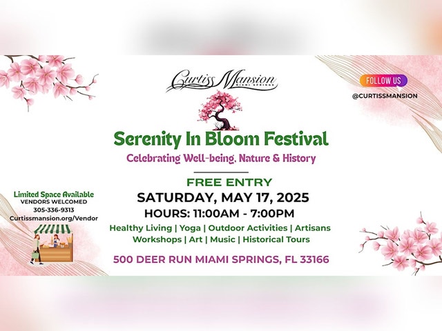 Serenity In Bloom - Celebrating Well-being, Nature & History Join us at the Curtiss Mansion for a day filled with relaxation, nature, and history! Immerse yourself in a serene environment surrounded by blooming flowers and lush greenery. This event is about well-being, nature & history so take a moment to unwind and rejuvenate your mind, body, and soul. Discover the rich history of the Curtiss Mansion. Don't miss out on this unique experience! 🌸 Let’s bloom together at Serenity In Bloom Festival 2025! 🌿✨ A Celebration of Wellness, Art, & Nature! ✨ 📅 Date | Fecha: Saturday, May 17, 2025 ⏰ Time | Horario: 11:00 AM - 7:00 PM 📍 Location | Ubicación: The Curtiss Mansion & Gardens – 500 Deer Run, Miami Springs, FL 33166 💲 Admission | Entrada: FREE! 🎟 https://serenity-in-bloom-festival.eventbrite.com 🌿 Discover, Connect & Experience the Magic! Join us for a one-of-a-kind outdoor festival celebrating health, creativity, and conscious living. Set in the historic and enchanting Curtiss Mansion & Gardens, this event offers an inspiring experience for all ages. ✨ What You’ll Enjoy: ✔ Health, Yoga & Wellness Sessions | Salud, Yoga y Bienestar ✔ Healing Therapies & Workshops | Terapias Holísticas y Talleres ✔ Live Music & Performances | Música en Vivo y Presentaciones ✔ Conscious Bazaar | Bazar Consciente (Fashion, Plants, Home Decor, Jewelry, Crystals & Much more ore) ✔ Healthy Living & Outdoor Activities | Vida Saludable y Actividades al Aire Libre ✔ Beauty & Self-Care | Belleza y Cuidado Personal ✔ Art Exhibitions & Handmade Creations | Arte y Creaciones Artesanales ✔ Spiritual & Holistic Practices | Prácticas Espirituales y Holísticas ✔ Historical Tours & Nature Walks | Recorridos Históricos y Senderismo 🎶 Come enjoy a day full of inspiration, transformation, and connection with like-minded souls. 📧 Vendor & Sponsor Application | Aplicación para Vendedores y Patrocinadores ✨For more info, contact us at: festivals@CurtissMansion.org ✨To Apply / Aplica aqui: CurtissMansion.org/Vendor 📞 Call/WhatsApp/Text: 305-336-9313 or 786-247-2298 💖 Bring your family & friends! This event is FREE and open to everyone. 🎟 RSVP NOW! Secure Your Free Entry Co-production preseted by Curtiss Mansion, Healing Arts Expo & DDV Soultions LLC
