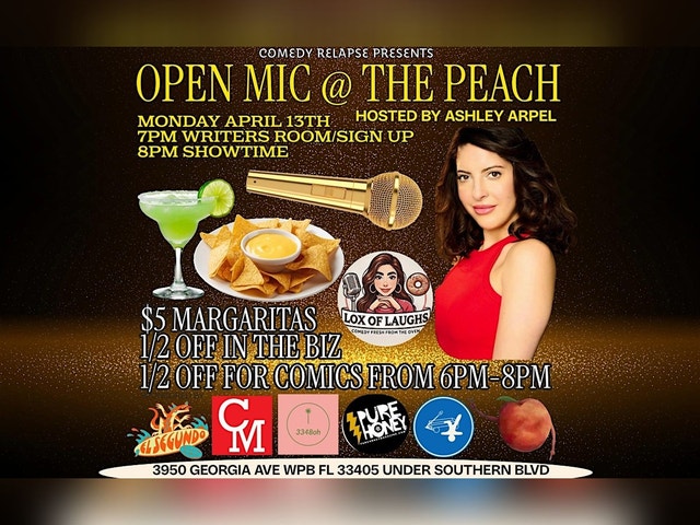 ENJOY ONE OF THE BEST OPEN MICS IN SOUTH FLORIDA.COME WATCH SOME OF THE FUNNIEST COMICS FOR FREE. MOST COMICS AT THE PEACH HAVE YEARS OF EXPERIENCE OR ARE JUST STARTING OUT. MOST OF THE COMICS ARE LOCAL BUT COMICS FROM ALL OVER THE WORLD HAVE POPPED IN TO TRY OUT NEW MATERIAL. ANYONE IS WELCOME TO PARTICIPATE IN THE OPEN MIC. COMICS GET A 5MIN SET AND ARE LIGHTED WHEN THEY HAVE ONE MINUTE LEFT. 7PM IS A WRITERS ROOM FOR COMICS AND AUDIENCE. THE WRITERS ROOM IS A WAY FOR COMICS TO TEST A FEW JOKES THEY HAVE NEVER TRIED OR ARE WORKING ON. THE AUDIENCE AND FELLOW COMEDIANS ARE ENCOURAGED TO ENGAGE WITH THE THE COMICS AND GIVE THEM FEEDBACK. THE SHOW STARTS AT 8PM EARLY SIGN UP AT COMEDYRELAPSE.COM