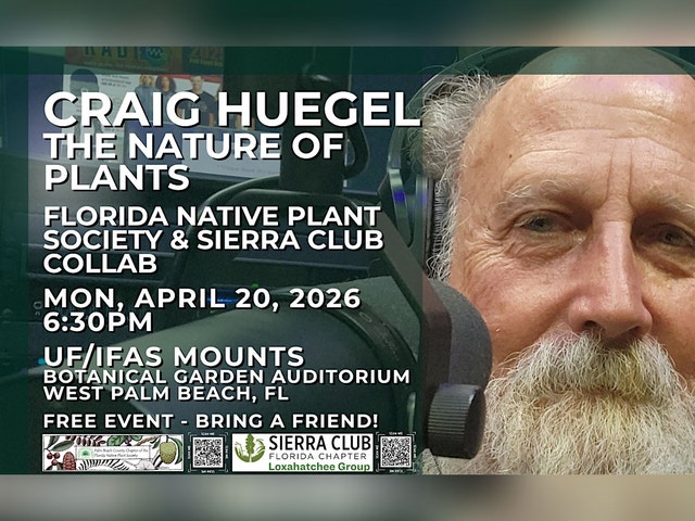 HTTPS://PALMBEACH.FNPSCHAPTERS.ORG/ [https://palmbeach.fnpschapters.org/] ENVIRONMENTAL GROUPS FLORIDA NATIVE PLANT SOCIETY - PALM BEACH COUNTY CHAPTER & SIERRA CLUB LOXAHATCHEE GROUP COLLAB Monthly Meeting Featured Speaker: Craig Huegel Topic: "The Nature of Plants" "Plants, again, inasmuch as they are without locomotion, present no great variety in their heterogeneous pacts. For, when the functions are but few, few also are the organs required to effect them. ... Animals, however, that not only live but perceive, present a great multiformity of pacts, and this diversity is greater in some animals than in others, being most varied in those to whose share has fallen not mere life but life of high degree. Now such an animal is man." This quote, attributed to Aristotle, is the way most of us think of plants; dull immobile creatures, certainly far less interesting than animals. That view has been forcefully overthrown in recent years by a large body of research that has shown that plants are far from being passive creatures but have adapted complex strategies to cope with the world around them. In a way, plants and animals are really not much different from each other. They just approach these challenges differently. LOCATION: IFAS / Mounts Botanical Garden Auditorium 531 N Military Trl, West Palm Beach, FL 33415 MONDAY, APRIL 20, 2026 - NOTE DATE CHANGE! 6:30pm-9pm Meetings are FREE to attend. Bring a friend! ____________________ To register with Sierra: https://act.sierraclub.org/events/details?formcampaignid=701Po0 [https://act.sierraclub.org/events/details?formcampaignid=701Po0] On Sierra Club Loxahatchee Group: The Loxahatchee Group is one of sixteen local Sierra groups in the state of Florida. We serve members in Palm Beach, Martin, St. Lucie, and Okeechobee counties in Southeast Florida. Our group offers members and prospective members opportunities to explore, enjoy, and protect the environment by volunteering, going on outings and becoming environmental activists. Welcome!Sierra Club mission statement is “to practice and promote the responsible use of the earth’s ecosystems and resources; To educate and enlist humanity to protect and restore the quality of the natural and human environment, and to use all lawful means to carry out these objectives.” The statement comprises of the listed components: 1. Protecting the environment 2. Improving livesThe primary duty of the Sierra Club is to maintain the stability of the environment by combating all elements of destruction. This organization has been championing for such issues through its advocates, community of volunteers, and other supporters. Sierra Club understands the essentiality of nature to the survival of humanity. It, therefore, commits all its resources to rally like-minded individuals to join its course and create a world where people can flourish and achieve their potentials.https://www.sierraclub.org/florida/loxahatchee [https://l.facebook.com/l.php?u=https%3A%2F%2Fwww.sierraclub.org%2Fflorida%2Floxahatchee%3Ffbclid%3DIwZXh0bgNhZW0CMTAAYnJpZBExRW5WTWpEZnVtQVU4TkZXSXNydGMGYXBwX2lkEDIyMjAzOTE3ODgyMDA4OTIAAR6jFmOPKq2hs7OUs_tZTaZ17Fz0C8W7ZOMEQcENC0oQBpjY8u4LcZi8kNUxnw_aem_IdwugATTjA-vzLhbJ0pPNA&h=AT4jAALD7DuE6ZKq19iiSSR6K9e3Uksa7oS7yvHDkgAJFB2P395uSCTYIRpk809OaPmdFdEiWGrMnwvuGg_9BkI2bbp2VOXA4zqauuhFzkceQlBzJ8YwQ2bwHtQah0-I5ufF_KbUv_6IuDdcWX7Z0Q&__tn__=q&c[0]=AT4F-bRGLdvP4hGcguMNfDvTx_24xjWkhuXQzt7ODCXpMnRv61iXx8ml8DHHWWUpU_pE8BkDh-3z9LQ-I7K5nz0WFXQXYUmEt-64Rlw3vGfz3h6Tp1SnwUZFHb3sH2Y6hJRgbtazAztduOX4j0f0a0Nua0ByUUkmQ_U] ____________________ On FNPS Palm Beach County MEETING INFO: Discover the wonders of native plants and their vital role in supporting local ecosystems, upon which life depends! We discuss various topics related to native plants, including their importance in providing native habitats, promoting biodiversity, and carving the pathway to sustainability. Our goal is to preserve, conserve, and restore the native plants and native plant communities of Florida. Whether you're a seasoned native expert, or just starting your journey, this meeting offers something for everyone. Learn from experienced members of our community who will share valuable insights and tips for creating your own sustainable garden. Connect with fellow advocates, exchange ideas, ask questions, and gain inspiration. Our popular native plant drawing follows the speaker program. This is a great way to learn from our knowledgeable members who share their expertise on specific native plants in hand, and it’s an opportunity to add hard-to-find plants to your own landscape. Don't miss the chance to connect with like-minded individuals; this event is a fantastic opportunity for champions of nature to gather and share their love for native plants and gardening. Also, we have snacks! Want to be part of our movement? To learn more about how to join us as a member, or volunteer, check us out! JOIN FNPS: https://palmbeach.fnpschapters.org/join-fnps-palm-beach-county/ [https://palmbeach.fnpschapters.org/join-fnps-palm-beach-county/] VOLUNTEER: email palmbeachfnps@gmail.com or call (561)285-7213 https://palmbeach.fnpschapters.org/ [https://palmbeach.fnpschapters.org/?fbclid=IwZXh0bgNhZW0CMTAAYnJpZBExRW5WTWpEZnVtQVU4TkZXSXNydGMGYXBwX2lkEDIyMjAzOTE3ODgyMDA4OTIAAR6TVdw7RpnIbkyBKwt5RIwtQ8heh_KH2AThnjhrJkKENw2kkOan7bkB-IwSMQ_aem_Sia3UMJ7i3k6qyaDAhqVYw] PLEASE "HEART" THIS EVENT TO RECEIVE UPDATES.