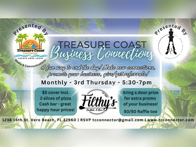 If you're looking to build your business, make new connections, deepen existing connections, give & get referrals, please come out and network with us! Here are the details: When: 3rd Thursday of the month - 5:30-7pm Where: Filthy's Fine Cocktails & Beer 1238 16th St. Vero Beach, FL 32960 Cover charge: $5 (cash only) per person Cash bar: best happy hour prices in town! Door prizes: bring a prize to get additional promotion of your business (optional). 50/50 raffle: half to the lucky winner & half to the kitchen/wait staff. Bring plenty of business cards! We will email all the attendees a photo of the business cards the following day. We get between 30-50 people every month, making it hard to fully work the room. With the cards, you'll be able to connect with those you didn't speak with at the event. RSVP is a must so we know how much pizza to prepare. At the last event, we had a lot of people show up who didn't register - which was fantastic - but it created a delay in getting enough pizza baked and served. They toss the dough on the premises and make the pies from scratch. There is now a Facebook group where you can promote your business, share educational and/or inspirational info, etc. Interact with other member's posts too. www.Facebook.com/groups/treasurecoastbusinessconnections [https://www.facebook.com/groups/treasurecoastbusinessconnections/?__cft__[0]=AZWHhSM60y4KYUcMSklF0puQIX9OtZVIGlapa87RlZ8YEcDaNp2ALORprfk1eKpXuQue-YERDBrKg9C8k9TmF7VY6EFO78FseE8mKg4smwYS-tOwDv_MrYq9A2P6-JNjiHRKDZOAmAXs149kBdbp5ILd1u6fcPykY5FCvorfLsy1Zw&__tn__=q] I'd like to say thank you to Angela & Nick of Filthy's for hosting the group! Be sure to follow them on social media, as they have something fun going on every night.www.Facebook.com/drinkatfilthys [https://www.facebook.com/drinkatfilthys?__cft__[0]=AZWHhSM60y4KYUcMSklF0puQIX9OtZVIGlapa87RlZ8YEcDaNp2ALORprfk1eKpXuQue-YERDBrKg9C8k9TmF7VY6EFO78FseE8mKg4smwYS-tOwDv_MrYq9A2P6-JNjiHRKDZOAmAXs149kBdbp5ILd1u6fcPykY5FCvorfLsy1Zw&__tn__=q] & www.Instagram.com/drinkatfilthys [https://l.facebook.com/l.php?u=https%3A%2F%2Fwww.Instagram.com%2Fdrinkatfilthys%3Ffbclid%3DIwZXh0bgNhZW0CMTAAAR1Ubjy699mWZt3QdV6agd8-DF2wMq0yQUHZ_wV7yY3Zker1p3nTViaRyIQ_aem_zymSDeEzd3ZuurqLrljSSA&h=AT2D1-TLvRTxJuD1kCYbO9gFNZmZNHK9Bt8MgVqLOLZOH2NQFrZo7uL-U3LfUEBTtyFwZlv9Bkls8k-2hjgpPUjUwuaSWVmOr9YWPjxeoYSUUk3At_SMKVg1BGVrQS_yCSMrZkRJ77Za9BOHsglo&__tn__=q&c[0]=AT3PzKYyY7QNdNuzXUCsXKzGKa9YCx7gmnrVxFFyOK1-WbhQ5hzKu4D4MbpF0kCi6QGVhcas_V4rkGOhRMDpWuyOH1Kx2CoHav3CHEpN5rCWt5SDDQLPQdJ9lxa0zVMBEfINcGD0IlP1AnjCPYDxpBMR-I47DMyMBKvJFNxDFIiCuUD5U3XY] We are looking forward to seeing everyone! Any questions, call either Ellen at 772-925-4557 or email tcconnector@gmail.com or Heather Brogan at 772-905-2552 or email chess.realty@yahoo.com. Your hosts, Ellen Contreras & Heather Brogan