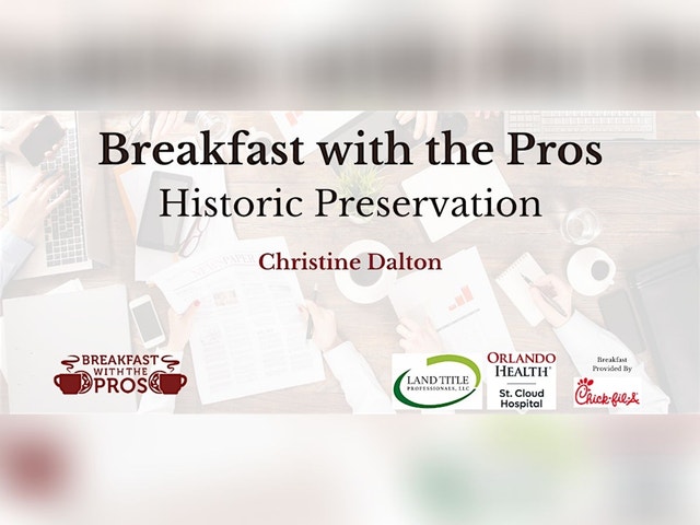 The event is free and breakfast is sponsored by Chick-fil-A, provided to the first 30 individuals. Early bird catches the worm! This event is sponsored by Land Title Professionals and Orlando Health - St. Cloud Hospital. Christine Dalton AICP will outline the City of St. Cloud's process and approach to Historic Preservation. This information is especially useful to owners, business owners and realtors within the historic district.