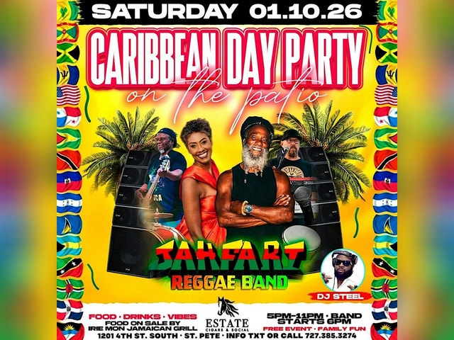 A vibrant outdoor gathering with reggae music, food from Jamaican Grill, and drinks