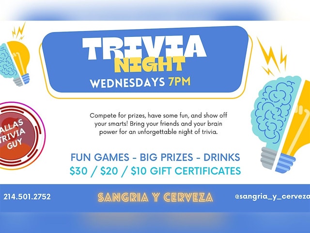 Trivia Night Join us for an exciting evening of brain teasers and laughter at Sangria y Cerveza - Tacos Lounge. Get ready to put your knowledge to the test and compete against fellow trivia enthusiasts. Whether you're a history buff, a pop culture junkie, or just love random facts, this event is for you! Grab your friends, form a team, and get ready for a night of friendly competition. Don't worry if you're not a trivia expert, it's all about having fun and enjoying the lively atmosphere. So mark your calendars and come join us for a night of entertainment and friendly banter. $30 Gift Certificate for first place, $20 for second place, and $10 for third place. See you there!