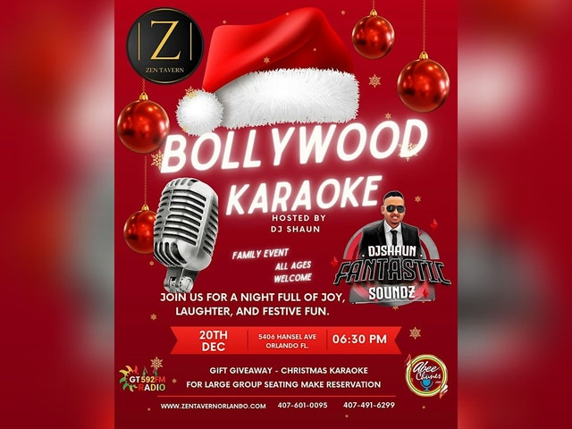 Get ready for a festive night of music, laughter, and holiday cheer! 🎶🎄 Zen Tavern invites you to our Bollywood Christmas Karaoke Night, hosted by DJ Shaun of Fantastic Soundz. Bring your family, bring your friends, and bring your best vocals—this is an all-ages, family-friendly celebration packed with joy and festive fun. Whether you’re singing your heart out or cheering from the crowd, it’s the perfect way to get into the holiday spirit. 📅 December 20th 📍 Zen Tavern — 5406 Hansel Ave, Orlando, FL ⏰ 6:30 PM ✨ Christmas Gift Giveaway ✨ Great vibes, great music, and unforgettable karaoke moments Planning to come with a large group? Reservations are recommended! For more info: 🌐 zentavernorlando.com 📞 407-601-0095 | 407-283-1515 | 407-491-6299