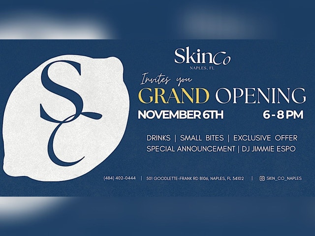 What to expect Join us on Thursday,11/6 for giveaways, free services add ons with booking, complimentary beverages, and more! N aples, you're invited to our grand opening party! Join us on Thursday, 11/6 from 6-8p for- * T hree chances to win a $100 SkinCo gift card * G ift bags for our first 50 guests * Complimentary service add ons – book a future appointment while you're here and get a free Celluma LED light treatment added on to any service * 10% off gift cards purchased at the party * Live treatment demonstrations with your SkinCo providers * Signature drinks from Bloom & Bottle Mobile Bar * Sweet treats and small bites from JAC’s Snacks * Event photography by Sophia WEA Photography (Plenty of photo-worthy moments inside our new SkinCo Naples space) * Live music by DJ Jimmie Espo A special announcement and the exclusive introduction of a new program revealed only to grand opening attendees RSVP to let us know you're coming. We can't wait to celebrate with you! WHEN T hursday, 11/6 • 6-8p WHERE S kinCo Naples 5 01 Goodlette Franke Rd N U nit B 106 ABOUT SKINCO SkinCo Naples is a female-founded, community-rooted medical aesthetics practice redefining what it means to care for your skin. Our approach blends science-backed treatments with a focus on wellness, confidence, and connection — creating a space where beauty meets balance. From advanced facials and laser treatments to curated skincare routines, every service is personalized to help you achieve healthy, radiant skin from the inside out. At SkinCo, we believe great skin is just the beginning — it’s about feeling empowered, confident, and part of a community that values self-care and authenticity.