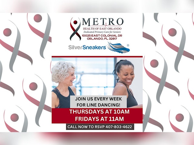 Join Us Every week at the MetroHealth East Orlando for Silver Sneakers Line Dancing 10025 East Colonial Drive Orlando, FL 32817 | (407) 803-4622 Join Us Every week at the MetroHealth East Orlando for Silver Sneakers Line Dancing class FRIDAYS at 11AM At Metro Health, we take pride in offering an extensive network of primary care doctors and health professionals dedicated to seniors. Our unique approach is a nod to the timeless tradition of healthcare, where your primary care physician isn't just a doctor, but a partner in health, coordinating meticulously with specialists to ensure you receive the best comprehensive medical care experience. Healthcare that's more than just a visit to the doctors office. It's care that understands and grows with you that is what is unique about the MetroHealth Experience. Not a MetroHealth member yet? Join our Golden Timers Club now and get your free T-Shirt! https://goldentimersclub.com/