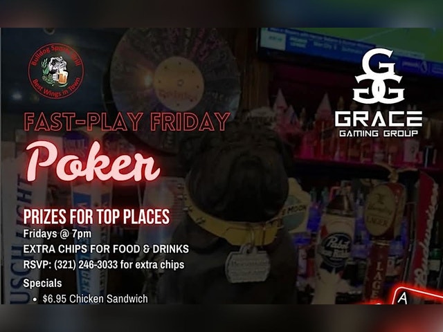Fast-Play Fridays every Friday at 7:00 PM at Bulldogs. Come out and test your luck at the poker tables. Compete to win a seat at the World Series of Poker in Las Vegas! Great food and drink specials all night long!