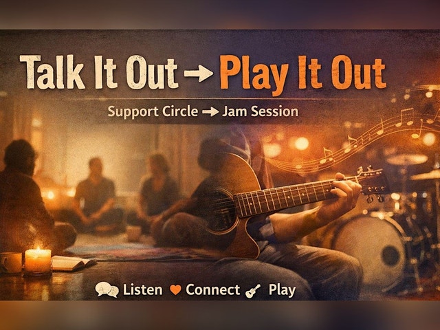 Talk It Out → Play It Out is a weekly community gathering built around connection, expression, and music. Family friendly.We start with a guided support circle—a safe, judgment-free space to check in, listen, and be heard. No pressure to speak, no fixing, no preaching. Just real humans showing up as they are.After the hour, we shift into Play It Out: an open, collaborative music session where instruments come out, ideas flow, and whatever you’re carrying gets expressed through sound. No skill level required. Come to talk. Come to listen. Come to play. Or just come to be. Support Circle → Open Music Session All instruments & experience levels welcome. Inclusive • Community-focused Talk it out. Then play it out.