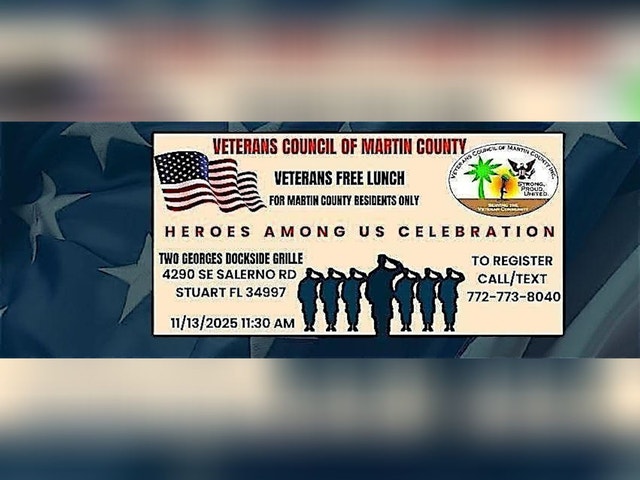 Martin County Residents Veterans Lunch Heroes Among Us Celebration Come join us at Two Georges Dockside Grille for a special event honoring the heroes in our community. This is a chance for Veterans who are residents in Martin County to come together to be shown appreciation. Let's celebrate their bravery and sacrifice with a delicious lunch and great company. The Veterans Council Of Martin County would like the opportunity to thank the heroes who have served our country. See you there! Please register here to attend or by emailing Veteranscouncilmartincounty@gmail.com