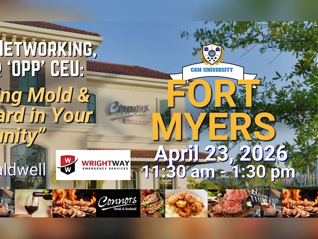 Join us at The Connors in Ft. Myers on April 23 for a complimentary lunch plus networking, and a 1-hour "OPP" CEU by Darrin Caldwell of Wrightway Restoration called "Handling Mold & Biohazard in Your Community." Get your CEU, network with great business partners, and enjoy lunch and drinks! 11:30 am - 1:30 pm