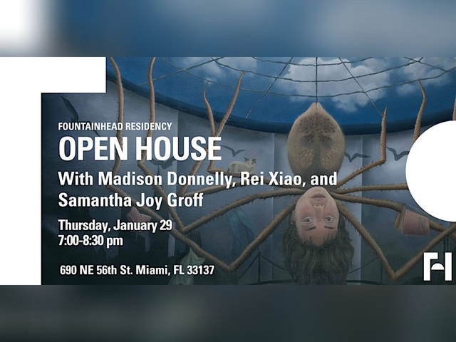 Join us for a casual open house to meet Session 1's resident artists Madison Donnelly, Rei Xiao, and Samantha Joy Groff. Our Open House is an opportunity to learn about their lives and inspirations and experience their work. Session 1's residency was generously sponsored by Leomi Foundation. Members' Open House / 6:00-7:00pm Become a member to gain early access and get a First Look at available works. Click here for more information. [https://www.fountainheadarts.org/join] Public Open House / 7:00-8:30pm Fountainhead is the oldest live/work residency in Miami, welcoming 24 national and international artists to the city each year. Every six weeks, Fountainhead welcomes the public into the residency to meet the artists and learn about their work and experience in Miami. To learn more, visit fountainheadarts.org.