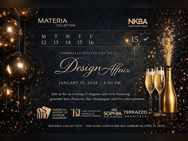 Design Affair is an intimate and refined evening hosted by Materia Collection, created for the design community in collaboration with NKBA South Florida. This elegant gathering brings together designers, vendors, and artists for a night of meaningful connections, inspiration, and shared appreciation for design and craftsmanship. This evening is proudly supported by our partners and sponsors — Terrazzo Granitech, Sophia Home Decoration, and Law Offices of Natalia M. Trushin-Jimenez, whose commitment to quality and excellence helps make this experience possible. Guests will enjoy: • Live music • Curated hors d’oeuvres • A champagne reception • A sophisticated design setting This event is designed as a relaxed yet elevated networking experience, where creativity, conversation, and collaboration naturally come together. We look forward to welcoming you for an evening defined by taste, detail, and community. Dress Code: Elegant / Cocktail Attire
