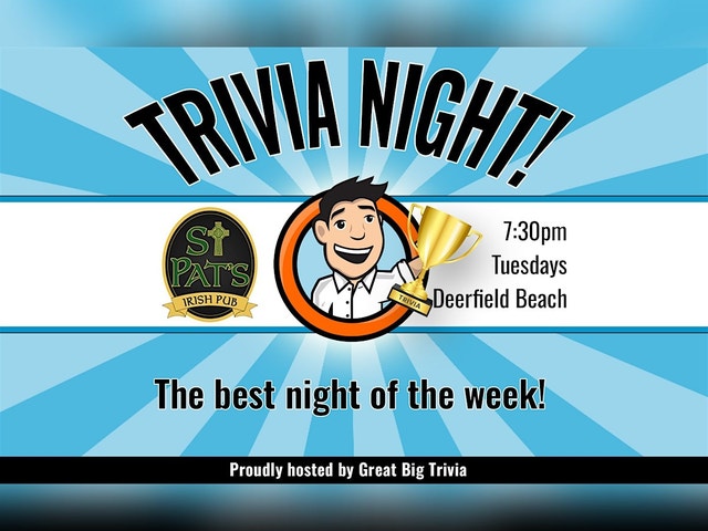 SEE YOU FOR TRIVIA NIGHT! Looking for a way to make your Tuesdays truly special? Join us at St. Pat's Irish Pub in Deerfield Beach for Great Big Trivia every Tuesday at 7:30 pm. St. Pat's provides the perfect backdrop for a memorable night, combining the charm of a classic Irish pub with a fun-filled event. Bring the whole family and enjoy their commitment to creating an enjoyable and vibrant atmosphere, complete with delicious food, your favorite drinks, and the most welcoming staff in town. It's more than just trivia; it's an opportunity to connect, relax, and have a great time in a place where you'll immediately feel at ease.