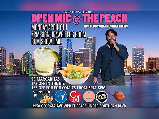 ENJOY ONE OF THE BEST OPEN MICS IN SOUTH FLORIDA.COME WATCH SOME OF THE FUNNIEST COMICS FOR FREE. MOST COMICS AT THE PEACH HAVE YEARS OF EXPERIENCE OR ARE JUST STARTING OUT. MOST OF THE COMICS ARE LOCAL BUT COMICS FROM ALL OVER THE WORLD HAVE POPPED IN TO TRY OUT NEW MATERIAL. ANYONE IS WELCOME TO PARTICIPATE IN THE OPEN MIC. COMICS GET A 5MIN SET AND ARE LIGHTED WHEN THEY HAVE ONE MINUTE LEFT. 7PM IS A WRITERS ROOM FOR COMICS AND AUDIENCE. THE WRITERS ROOM IS A WAY FOR COMICS TO TEST A FEW JOKES THEY HAVE NEVER TRIED OR ARE WORKING ON. THE AUDIENCE AND FELLOW COMEDIANS ARE ENCOURAGED TO ENGAGE WITH THE THE COMICS AND GIVE THEM FEEDBACK. THE SHOW STARTS AT 8PM EARLY SIGN UP AT COMEDYRELAPSE.COM