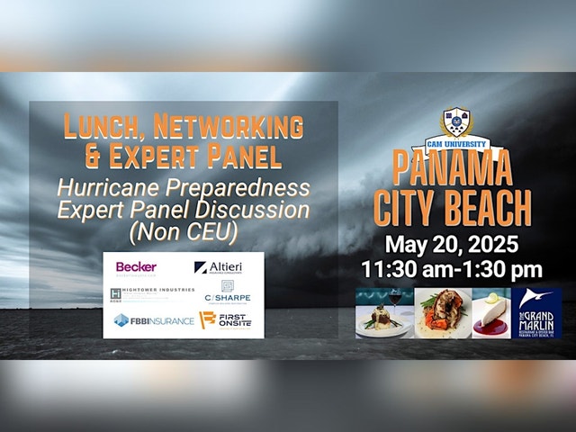Join us for a fabulous complimentary lunch, networking, and a non-CEU expert panel discussion by Becker, Hightower Industries, Altieri, C-Sharpe, FBBI, and First Onsite Restoration on "Hurricane Preparedness" at The Grand Marlin. Get informed, network with great business partners, and enjoy an amazing lunch! 11:30 am to 1:30 pm