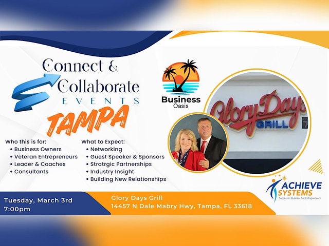 Join us for an evening of meaningful networking, collaboration, and expert insights at The Connect & Collaborate Tampa Events by Business Oasis Networking, Tampa’s premier business networking experience for entrepreneurs, veterans, professionals, and small business leaders. What to Expect: High-impact networking with like-minded business professionals Sponsor Spotlights – Promote your business for only $25 https://businessoasis.org/.../connect-collaborate-sponsor/ [https://businessoasis.org/product/connect-collaborate-sponsor/?fbclid=IwZXh0bgNhZW0CMTAAYnJpZBEyUVJwbXZwR3B0cU9haERtanNydGMGYXBwX2lkEDIyMjAzOTE3ODgyMDA4OTIAAR4M-cpYxta9k9HbcbhRE6RKVKU-EPEeUqgmahZSutR6GkK62lFbhdTvCfJ08w_aem_CKU3GVjWfoGJ0JTWrXZPwg] A relaxed, vibrant atmosphere at Glory Days Grill Featured Speaker: TBD Free to attend – Registration required! Find out more about Business Oasis Visit: www.businessoasis.org [http://www.businessoasis.org/?fbclid=IwZXh0bgNhZW0CMTAAYnJpZBEyUVJwbXZwR3B0cU9haERtanNydGMGYXBwX2lkEDIyMjAzOTE3ODgyMDA4OTIAAR73C9VntfUON_SMCPYYAa5Y94AVV6kR5D6YjTD6bKxoLnieAcy5a-4JN0p_jA_aem_2vd627d1FxQdtOmnlzoqgA]