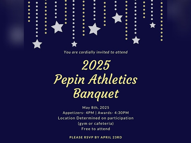 Welcome to the 2025 Pepin Athletics Banquet! Come join us for a night of celebration and recognition of our outstanding athletes at Pepin Academies Riverview Campus. This in-person event promises to be a fun-filled evening with awards, speeches, and delicious food. Get ready to cheer for our dedicated athletes and show your support for their hard work and achievements. Don't miss out on this special occasion to honor our sports stars and enjoy a memorable evening with the Pepin community. See you there!