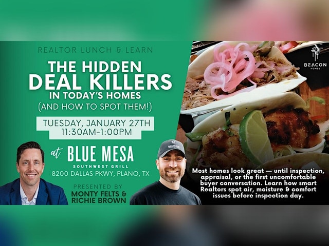 THE HIDDEN DEAL KILLERS IN TODAY’S HOMES (AND HOW TO SPOT THEM) Most homes look great — until inspection, appraisal, or the first uncomfortable buyer conversation. In this free Lunch & Learn, Realtors will learn how hidden issues with airflow, moisture, and temperature control quietly impact comfort, indoor air quality, and long-term durability — and why these problems are often behind inspection objections, buyer hesitation, renegotiations, and post-closing complaints. This session is designed for Realtors who want to: * Ask better questions during showings * Spot red flags before inspection day * Educate buyers with confidence (without overstepping) * Reduce deal friction, surprises, and unnecessary stress You’ll walk away with a practical, easy-to-use framework for evaluating homes beyond finishes and staging — helping you protect your clients and your reputation. 🎤 ABOUT THE SPEAKER Richie Brown, Founder & CEO of Beacon Homes, specializes in building and evaluating homes that perform well long after closing day. A former SEC and NFL athlete, Richie brings a performance-driven mindset to residential construction, with deep expertise in moisture control, ventilation, airtight construction, and long-term home durability — the exact issues that tend to surface during inspections or after buyers move in. He works closely with homeowners, builders, and real estate professionals to identify common (and costly) comfort, humidity, and air-quality issues — and explains them in plain English, not construction jargon. 📅 EVENT DETAILS * Date: Tuesday, January 27 * Time: 11:30 AM – 1:00 PM * Location: Blue Mesa Grill in Plano * Cost: Free (Lunch provided with RSVP)