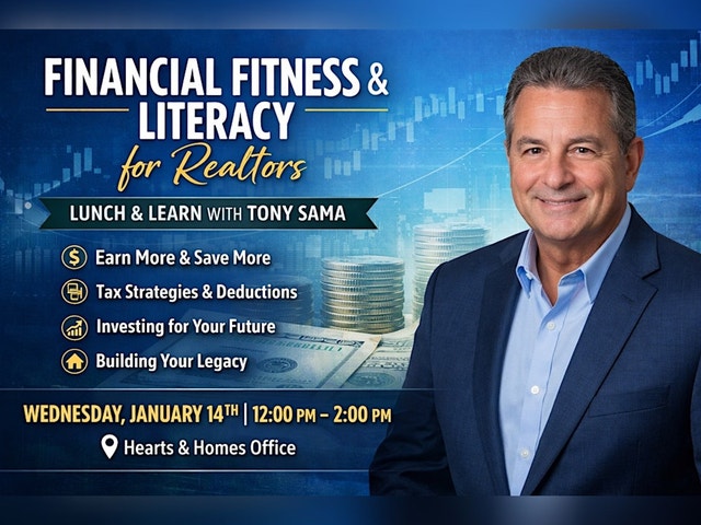 Are you ready to take control of your finances and maximize your earning, saving, and investing potential in 2026? Join us for a FREE Financial Fitness & Literacy Lunch + Learn specially designed for Realtors! 📅 Wednesday, January 14th 🕛 12:00pm – 2:00pm 📍 Hearts & Homes Office - 1826 SE Port St Lucie Blvd. What to Expect: 🎓 Expert financial guidance by Tony Sama, CEO of TMI & Associates, Inc. — a trusted financial advisory firm with 30+ years helping individuals and small business owners grow income, reduce taxes, and build long-term wealth. TMI Associates Business Services [https://www.tmiassociates.net/about-us.html?utm_source=chatgpt.com] 🍽️ Complimentary lunch 🤝 Networking with local Realtors 💡 Actionable strategies on: • How to structure your business for financial success • Smart tax strategies every agent should use • What you can (and can’t) write off • How to manage cash flow like a top producer • The financial habits that lead to long‑term wealth Whether you’re just starting your real estate journey or looking to level up your financial strategy, this event will empower you with clarity and confidence. Seats are limited — reserve your spot today! 👉 Register Now!