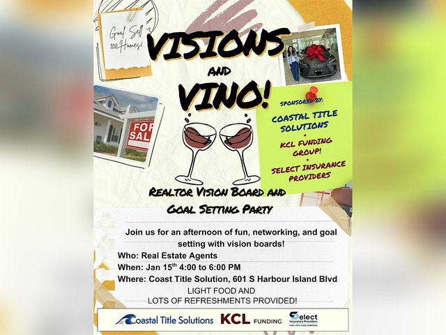 Start 2026 with purpose — and a little Pinot. Visions & Vino is back for year two, and we’re turning goal-setting into a fun, inspiring afternoon for Tampa and Pinellas County real estate agents. Think: vision boards, great people, good energy, light bites, and the kind of conversations that actually move your business forward. Brought to you by Coastal Title Solutions, KCL Funding, and Selecte Insurance Providers, this isn’t another dry “planning meeting.” We'll be discussing and creating vision boards. It’s a relaxed, creative space to map out what you want your next year to look like — professionally and personally — while connecting with agents who are just as driven as you are. VISION BOARDS AND GOAL-SETTING ACTUALLY WORK: Research backs it up: * People who write down or visualize their goals are 42% more likely to achieve them (Dominican University study). * Professionals who regularly set goals are 376% more likely to report success compared to those who don’t (Harvard Business Study). * Creating visual, emotionally engaging goals boosts follow-through because your brain treats them like a roadmap, not a daydream. So yes, the craft supplies matter — but the clarity you walk out with matters more. Date: January 15th Time: 4:00 PM – 6:00 PM Location: Coastal Title Solutions 601 S Harbour Island Blvd, Suite 133, Tampa, FL Enter the main door, turn left at American Social, enter the coworking space and the room is on the left! Who’s Invited: Real estate agents (only) who want to set bigger goals, make meaningful connections, and step into 2026 with focus and momentum. What’s Included: ✔ Wine & refreshments ✔ Light food ✔ Vision board materials (your magazines are welcome too!) ✔ A room full of ambitious, like-minded agents ✔ The spark you’ve been needing to reset and recharge HOSTED & SPONSORED BY: KCL funding Group Coastal Title Solutions Select Insurance Providers Join us, get clear on your goals, build something inspiring, and kick off 2026 with intention and a little vino.