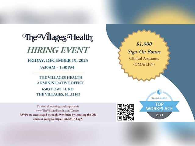 The Villages Health is a patient-centered, primary care driven, multi-specialty medical group with over 800 team members. We are top-rated for both quality of care and patient loyalty, and we are looking for exceptional professionals to join our dream team. Join us to meet our hiring managers, learn about The Villages Health and interview for such roles as: Audiology Assistant Business Applications Support Specialist II Cardiology Specialty Coordinator Certified Medical Coder Clinical Assistant (CMA/LPN) (Multiple) Clinical Assistant (CMA/LPN) (Float & Specialty) Insurance Agent Relations Specialist Lobby Host New Patient Advisor New Patient Specialist (Float) Nuclear Medicine Technologist (PRN) Patient Support Operator (Call Center, Full-Time & Part-Time) Phlebotomist Practice Support (Multiple) Registered Diagnostic Sonographer (Urology) Sales & Community Outreach Coordinator X-Ray Tech (FT/Float) And many more... Thank you for your interest in joining The Villages Health team! Please check our careers page (www.thevillageshealth.com/careers) regularly for the most up-to-date list of current openings, as positions may be filled before our hiring event. Please bring your resume, professional portfolio, and/or copies of any licenses/certifications you have.