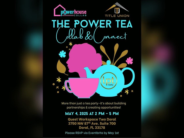 Powerhouse Collab & Title Union are proud to present the Power Tea Party where entrepreneurial women will showcase their small businesses in a collaborative community of successful women! Wear a beautiful hat and join us for an exciting afternoon of live product demos, mini styling sessions and interactive displays along with free samples and great door prizes. Tea-inspired refreshments and delectable delights will be served. Some of our Incredible Lineup of Participating Businesses include: 1. Looks by Jazmin Nin: Make-up & Brows @looksbyjazminnin 2. Aquavida Swimsuits: Swimwear @aquavidasw 3. Angel-Soto Law: Homeowners Attorney @sandyangelsotoesq 4. Zaida Nails: Professional Nail Artist @zaidanails.usa 5. AP Financial: Financial Advisor @annetteperez__ 6. Lifewave X39: Wellness Patches @realtoramarilisvazquez 7. RejuvaSkin Medspa: Skincare @rejuvaskinmedspa 8. Con Amor Mima: Desserts/Sweets @conamormima 9. Bella's Blinds: Blinds/Curtains @bellasblinds 10. Mindful Movements for Life: Yoga/Health Coach @mindfulmovementsforlife 11. Candles of Dreams: Handmade Candles @candlesofdreams_handmade__ 12. Salsa Onyx Miami: Salsa Studio @salsaonyxstudio 13. Living Water IV & Wellness: IV Cocktails & Beauty Treatments @livingwateriv 14. DS Decoration Art: Personalized Gifts @dsdecorationart 15. GabisasWorld: Handmade Jewelry @gabisasworld 16. Maya by Letty - La Boutique: Purses & Accessories @mayabyletty 17. Party Studio Events: Party Decor @partystudioevents 18. Fashion Evolver: Dresses & More @fashionevolver And More... As an added bonus, we are including a section called, "Spill the Tea" where Powerhouse Collab & Title Union will share information on homeownership, investment opportunities, title & closing services, podcast content studio and the benefits of joining LPT Realty.