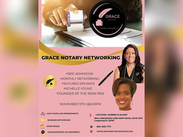 GRACE NOTARY INVITES YOU TO OUR MONTHLY NETWORKING EVENT. OUR KEYNOTE SPEAKER WILL BE MICHELLE YOUNG OF THE IRON PEN. COME OUT AND ENJOY AN EVENING OF GREAT CONVERSATION, CONNECTION AND BUILD COMMUNITY. THERE WILL BE LIGHT REFRESHEMENTS SERVED, MUSIC, DOOR PRIZES AND YES! NETWORKING! CAN'T WAIT SEE YOU THERE! REGISTER TODAY! LOCATION: 1844 LONGWOOD LAKE MARY ROAD, SUITE 1070, LONGWOOD FL 32750 CONTACT: FARRA @ 864-832-7711 EMAIL: GRACENOTARY2026@GMAIL.COM FB: FARRA MILLS-WORRELL TIKTOK: @GRACENOTARY IG: @GRACEGIRLNOTARY