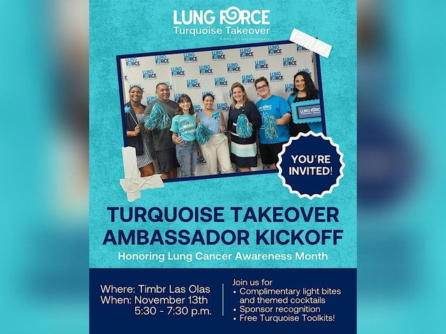 Join Us for the Turquoise Takeover Ambassador Kickoff Rally! 📅 Date & Time: Wednesday, November 13 | 5:30 PM – 7:30 PM 📍 Location: Timbr Las Olas November is Lung Cancer Awareness Month, and there’s no better way to honor this important observance than by joining our movement for lung health! This high-energy kickoff event launches our 2025 Turquoise Takeover Ambassador Competition and rallies Corporate Ambassadors, community leaders, and supporters to shine a light on lung cancer and lung disease. Whether you’re a returning champion or brand-new to the campaign, this evening will inspire you, connect you with like-minded advocates, and give you the tools to make an even bigger impact this season. What to Expect: ✨ Networking with community leaders & corporate teams ✨ Tips to maximize your impact and rally your workplace ✨ Chances to win prizes & earn team incentives ✨ Invitations to special team-building socials throughout the season Admission is FREE and includes lite bites, drinks, and a complimentary Turquoise Takeover Toolkit to jump-start your campaign. Bring a colleague, a friend, or your whole team — everyone is welcome! Together, we’ll make this Lung Cancer Awareness campaign unforgettable and create a healthier future for all. RSVP today and take the first step toward making an impact this season!