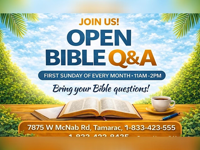 What Does the Bible Say? Open Bible Q & A is an inviting monthly gathering where the Word of God is the centerpiece. Join us for an open and interactive session designed for seekers and believers—anyone who desires to understand what Scripture says in its proper context. This is not a debate club and not a lecture-only format. It is a welcoming environment where you are encouraged to bring your questions about faith, commandments, grace, daily living, history, and difficult passages. Experienced facilitators from IOG South Florida Evangelism Outreach will walk through the Scriptures together, allowing the Bible to explain the Bible. What to Expect • A relaxed, community atmosphere • Scripture-based answers from both Old and New Testament • Guidance on how to study the Word for yourself • Fellowship with visitors from South Florida and the Caribbean region • First-time guests welcome—no question is too small Bring • Your Bible • Your written questions or topics • Family and friends who want to hear the Word As Jesus taught in Isaiah 56:7, God’s house is to be a house of prayer for all people. Our goal is simple: Sharing the Truth • Spreading the Word. Come and experience an afternoon devoted to understanding Scripture and learning how to walk it out in real life