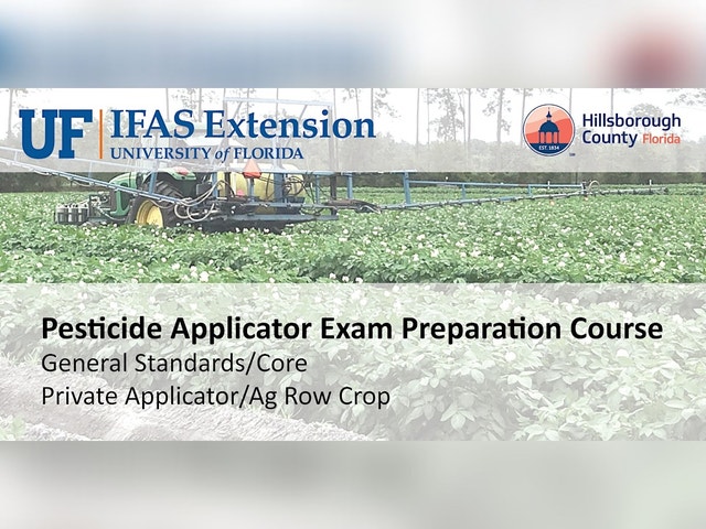 Location: UF/IFAS Extension, Hillsborough County (5339 County Road 579, Seffner, FL 33584) We will discuss the main concepts for an Agriculture Pest Control Applicator (Private, Public, and commercial) and prepare you for the required exams. Testing will be offered in a special session the following day for the program attendees. Program - Agenda: 09:00 a.m. Welcome, coffee & snacks 09:15 a.m. General Standards/Core Exam Preparation Class 11:30 p.m. Lunch (to be provided) 12:15 p.m. Private/Ag Row Crop Applicator Exam Preparation Class 02:30 p.m. Review 04:00 pm. How to sign up for the license test 04:30 p.m. Adjourn Testing: Testing is no longer offered through the University of Florida! Testing is done with FDACS through EVERBLUE [https://aeslicensing.fdacs.gov/]. More information will be provided during the training. Study manuals are not required, but are recommended, at least one manual per group. The manuals are available through IFAS/Bookstore * General Standards [http://ifasbooks.ifas.ufl.edu/p-104-applying-pesticides-correctly-a-guide-for-pesticide-applicators-core.aspx] * Private (for growers and producers) [http://ifasbooks.ifas.ufl.edu/p-118-private-applicator-agricultural-pest-control.aspx] * Ag Row crop (for public and commercial applicators) [http://ifasbooks.ifas.ufl.edu/p-107-agricultural-row-crop-pest-control.aspx] For more information, please contact : Dr. Wael Elwakil, Extension Agent II, Fruit & Vegetable Production P: (813) 744-5519 Ext. 54134 E: Wael.Elwakil@ufl.edu