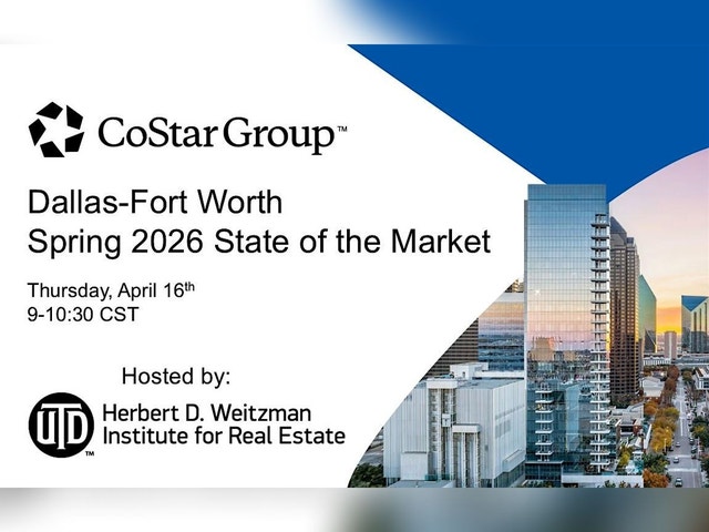 [EVENT SOLD OUT - PLEASE JOIN THE WAITLIST FOR ANY POTENTIAL OPENINGS] JOIN US FOR THE DALLAS-FORT WORTH MARKET SPRING STATE OF THE MARKET! Get the latest scoop on Dallas-Fort Worth market trends and forecasts at UT Dallas! You’re invited to join us for an exclusive session reviewing the Dallas-Fort Worth commercial real estate market performance in 2025 and sharing our outlook for 2026. We’ll cover key themes across: * Office * Industrial * Retail * Multifamily Space is limited, so RSVP soon! Looking forward to you joining us! Special thanks to the Herbert D. Weitzman Institute for Real Estate at UT Dallas for hosting us!