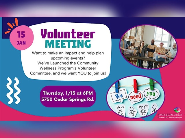 The Community Wellness Program (CWP) has launched a new Volunteer Committee—and we want you to be part of it! This committee will help guide CWP programming by sharing community needs, offering feedback, and supporting upcoming events. Join us for our first interest meeting to learn more about the committee, meet other community members, and help us plan activities for January and February. At this meeting, we will: * Introduce the purpose and goals of the Volunteer Committee * Talk about opportunities for involvement and leadership * Gather community input on the types of events, workshops, and conversations you want to see * Begin planning CWP events for the first two months of the year Date: Thursday, 1/15 Time: 6:00 PM Location: Resource Center – 5750 Cedar Springs Rd, Dallas, TX Whether you’re passionate about wellness, community-building, event planning, or simply want your voice to be heard, this is a great way to get involved and help shape the future of our programming. All LGBTQ+ adults are welcome. We hope to see you there! 🌈