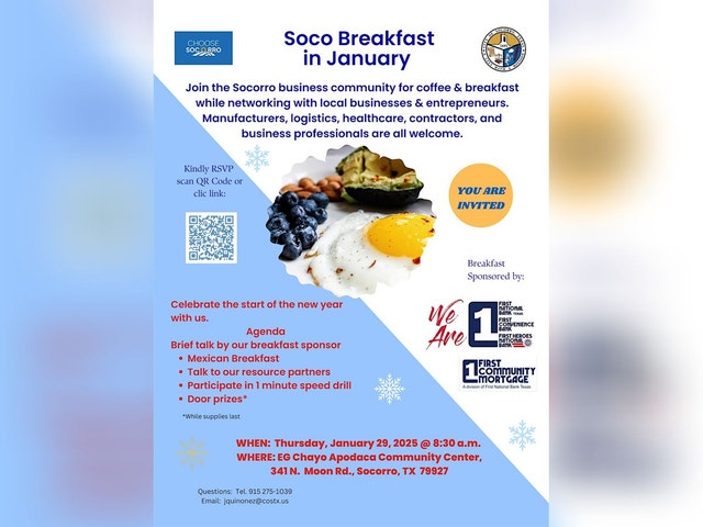 Kick off the year with Socorro's entrepreneurial community over breakfast sponsored by First National Bank Start off the new year with Socorro's entrepreneurial community at its first Soco Breakfast. First National Bank is our breakfast sponsor.