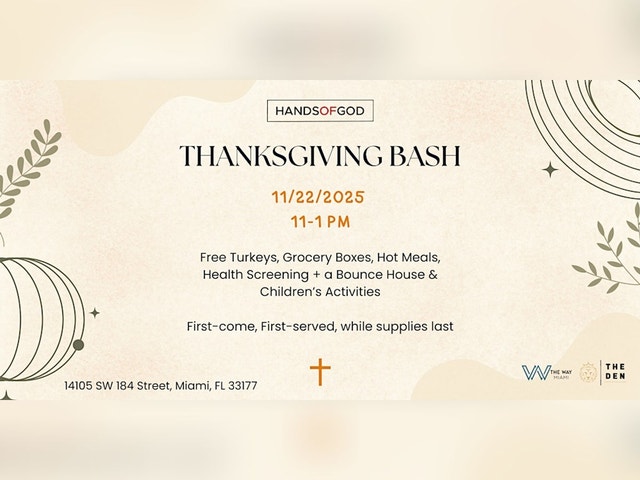 A community event that you don't want to miss! Bring your entire family as we celebrate Thanksgiving together! We will distribute turkeys, grocery boxes, and hot meals! Receive a free health screening while your children enjoy a bounce house and many games and activities. All items are free of charge, first-come, first-served basis, until supplies last. Entrance is on SW 142 Ave., parking is available on lot.