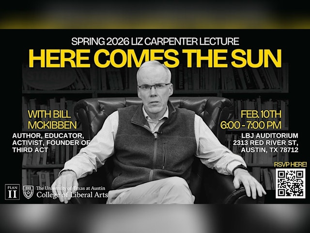 Join the Plan II Honors Program for our Spring 2026 Liz Carpenter Lecture with award-winning author, activist, and educator Bill McKibben to celebrate his most recent book, Here Comes the Sun. McKibben will be in conversation with KUT's senior energy and environment correspondent, Mose Buchele. The lecture will begin promptly at 6PM in the LBJ Auditorium on 2313 Red River Street. Doors will open 15-20 minutes beforehand. Complimentary parking is available in Lot 40 (Red River & Dean Keeton). ** Bill McKibben is founder of Third Act, which organizes people over the age of 60 for action on climate and justice. His 1989 book The End of Nature is regarded as the first book for a general audience about climate change, and has appeared in 24 languages. He’s gone on to write 20 books, and his work appears regularly in periodicals from the New Yorker to Rolling Stone. He serves as the Schumann Distinguished Scholar in Environmental Studies at Middlebury College, as a fellow of the American Academy of Arts and Sciences, and he has won the Gandhi Peace Prize as well as honorary degrees from 20 colleges and universities. He was awarded the Right Livelihood Award, sometimes called the alternative Nobel, in the Swedish Parliament. Foreign Policy named him to its inaugural list of the world’s 100 most important global thinkers. McKibben helped found 350.org, the first global grassroots climate campaign, which has organized protests on every continent, including Antarctica, for climate action. He played a leading role in launching the opposition to big oil pipeline projects like Keystone XL, and the fossil fuel divestment campaign, which has become the biggest anti-corporate campaign in history, with endowments worth more than $40 trillion stepping back from oil, gas and coal. He stepped down as board chair of 350 in 2015, and left the board and stepped down from his volunteer role as senior adviser in 2020, accepting emeritus status. He lives in the mountains above Lake Champlain with his wife, the writer Sue Halpern, where he spends as much time as possible outdoors. In 2014, biologists credited his career by naming a new species of woodland gnat—Megophthalmidia mckibbeni–in his honor.
