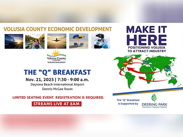 Join Volusia County Economic Development for the “Q” Breakfast" with a panel discussion on "Make It Here. Positioning Volusia to Attract Industry." Guest panelists include: * Keith Norden, President/CEO Team Volusia Economic Development Corp. * Ernie Audino, Executive Vice President, CEO Business Alliance Lou Paris, director of the Volusia County Division of Economic Development, will discuss the county’s third quarter 2025 economic data which includes new residential and commercial construction permit activity, redevelopment permit activity, and municipal and county labor statistics. The report also highlights data on companies’ reshoring operations to the U.S. and the opportunities to attract industry to this area. This is an excellent opportunity to interact with elected officials, community partners and stakeholders, and to learn more about the state of Volusia County's economy. Event Time: 7:30 - 9:00 a.m. Check-in and breakfast begins at 7:30 a.m. Program begins at 8:00 a.m.