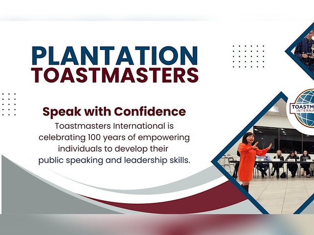 Are you afraid of speaking in public? Having trouble finding the right words to say in a group? Maybe you just want to improve your public speaking skills. Plantation Toastmasters is here to help! Plantation Toastmasters, a club with over 50 years of proven success, is currently accepting applications for new members. In addition to learning the art of communication and meeting interesting people, having fun is always on the agenda! Guest visits are free of charge, so please come check us out! See you on Tuesday! Plantation Toastmasters! As much fun to listen as it is to speak! Visit our website: PlantationToastmasters.com [https://plantationtoastmasters.com/]! Follow us: Facebook [https://www.facebook.com/groups/PlantationToastmasters] | Instagram [https://www.instagram.com/plantationtoastmasters/] | LinkedIn [https://www.linkedin.com/in/plantation-toastmasters-59316a19b/]