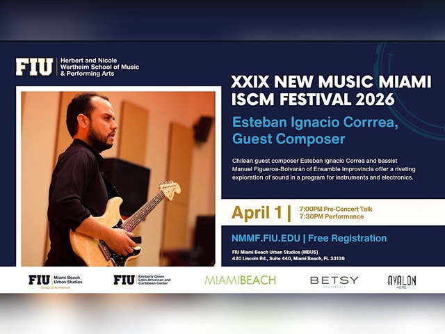 Chilean guest composer Esteban Ignacio Correa and bassist Manuel Figueroa-Bolvarán — the creative forces behind Ensamble Improvincia — present a riveting program for instruments and electronics at The Betsy South Beach Hotel Gallery. Correa, an established concert composer with a catalog of nearly 50 works spanning orchestral, chamber, solo, and theatrical music performed across Chile and internationally, brings expressive depth and inventive sound design to this evening’s performance. His music has been commissioned and presented by leading ensembles throughout Latin America. Figueroa-Bolvarán, a Chilean double bass virtuoso, composer, and educator, is known for his commanding stage presence and versatility across genres. He has premiered concertos and chamber works worldwide, performed with renowned ensembles including the Civic Orchestra of Chicago and the Orchestra of the Americas, and appeared on award-winning recordings. As Ensamble Improvincia, the duo explores the intersection of acoustic instruments and live electronics, offering an immersive concert experience shaped by adventurous performance, inventive sound worlds, and cross-cultural perspectives. The festival is presented by the FIU Wertheim School of Music & Performing Arts, with support from the City of Miami Beach, the Kimberly Green Latin American and Caribbean Center at Florida International University, FIU Miami Beach Urban Studios, and The Betsy South Beach Hotel and The Betsy Writers Room. The Avalon Hotel Miami Beach on Ocean Drive is the official host hotel for the festival.