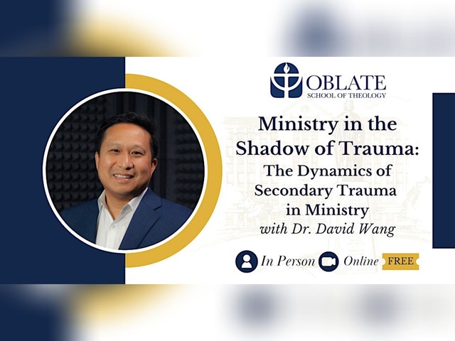 MINISTRY IN THE SHADOW OF TRAUMA: THE DYNAMICS OF SECONDARY TRAUMA IN MINISTRY Speaker: Dr. David Wang Join us at Oblate School of Theology for a special event featuring Dr. David C. Wang, Professor of Pastoral Psychology at Fuller Theological Seminary. The Christian faith is built upon a trauma — the trauma of Christ’s death on the cross. Even after his resurrection, the memories and wounds of the crucifixion persist (John 20:19–23). In this lecture presentation, Dr. Wang will explore this passage more deeply, drawing connections to recent research on the prevalence of direct and indirect trauma exposure among clergy. He will introduce literature on secondary and vicarious trauma and discuss how clergy and spiritual leaders can navigate ministry contexts where they encounter the emotional and trauma-related needs of the communities they serve. The evening begins with an OST Alumni Pre-lecture Reception and Gathering at 6:00 PM in the Whitley Event Center Lounge, followed by the public lecture at 7:00 PM in the Whitley Event Center. 📅 Thursday, February 5, 2026 * 6:00 PM CST | OST Alumni Pre-lecture Reception and Gathering Whitley Event Center Lounge (Alumni only - In Person Only) * 7:00 PM CST | Public Lecture and Q&A Whitley Event Center 101 (Open to all - In Person & Online) Location: Oblate School of Theology 285 Oblate Drive San Antonio, TX 78216 This event is free and open to the public, but registration is required.
