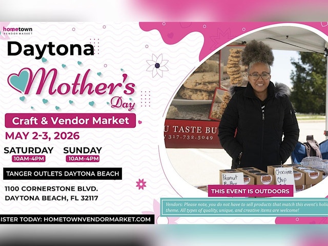💐 CELEBRATE MOM AT THE DAYTONA MOTHER'S DAY CRAFT & VENDOR MARKET! 💐 DATES & TIMES: * Saturday, May 2, 2026 | 10am – 4pm * Sunday, May 3, 2026 | 10am – 4pm Join us for a heartwarming weekend featuring local vendors, delightful treats, and thoughtful gift ideas to celebrate and honor the amazing moms in your life! 🌸 To secure your spot, visit: hometownvendormarket.com. Vendor Application: hometownvendormarket.com 🛍️ Registration is NOW OPEN! Don’t miss this opportunity to showcase your unique products to a vibrant audience. Be part of this special event as shoppers look for handmade gifts, specialty items, and memorable keepsakes to celebrate love. As a vendor, you'll have the chance to connect with enthusiastic shoppers and spread Mother’s Day joy. Reserve your space today and make unforgettable connections! Spots are limited and filling up quickly! Don’t wait—secure your spot now by visiting: hometownvendormarket.com. ✨ Let’s make the Mother’s Day Craft & Vendor Market a memorable and successful celebration! 💖 We can’t wait to see you there! 🌷💐